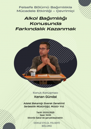 Felsefe Bölümü tarafından düzenlenen bu çevrimiçi seminer, alkol bağımlılığı konusunda farkındalık kazandırmayı amaçlamaktadır. Konuk konuşmacı Kenan Gündal, bağımlılığı toplumsal ve önleyici yönleriyle ele alarak katılımcıları bilgilendirmeyi ve bu kritik konuda daha bilinçli ve sorumlu bir yaklaşım geliştirilmesine katkı sunmayı hedeflemektedir.