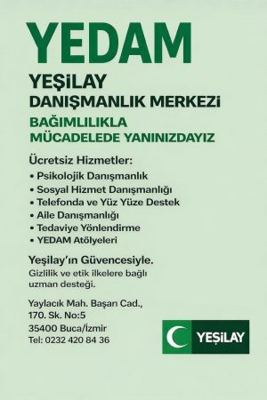 Yeşilay Danışmanlık Merkezi (YEDAM) tarafından bağımlılıkla mücadele kapsamında sunulan ücretsiz psikolojik ve sosyal destek hizmetlerine ilişkin bilgilendirme afişi aşağıda yer almaktadır.